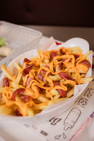 $3.50Salchicha jumbo, tocino picado, papas hilo y full salsas.